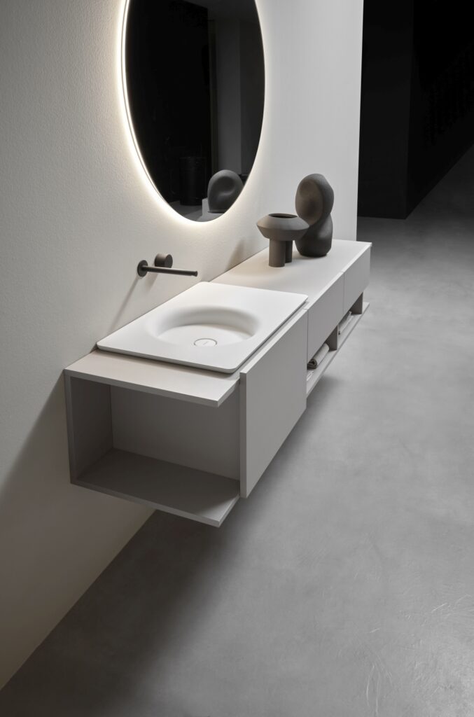 Uno degli aspetti più innovativi del sistema è la libertà decisionale in fase di montaggio: la configurazione non deve essere definita al momento dell’ordine, ma può essere stabilita direttamente in cantiere. Anche la rubinetteria può essere posizionata a destra o a sinistra del bacino, indipendentemente dall’orientamento del lavabo, con la possibilità di installazione anche a parete.