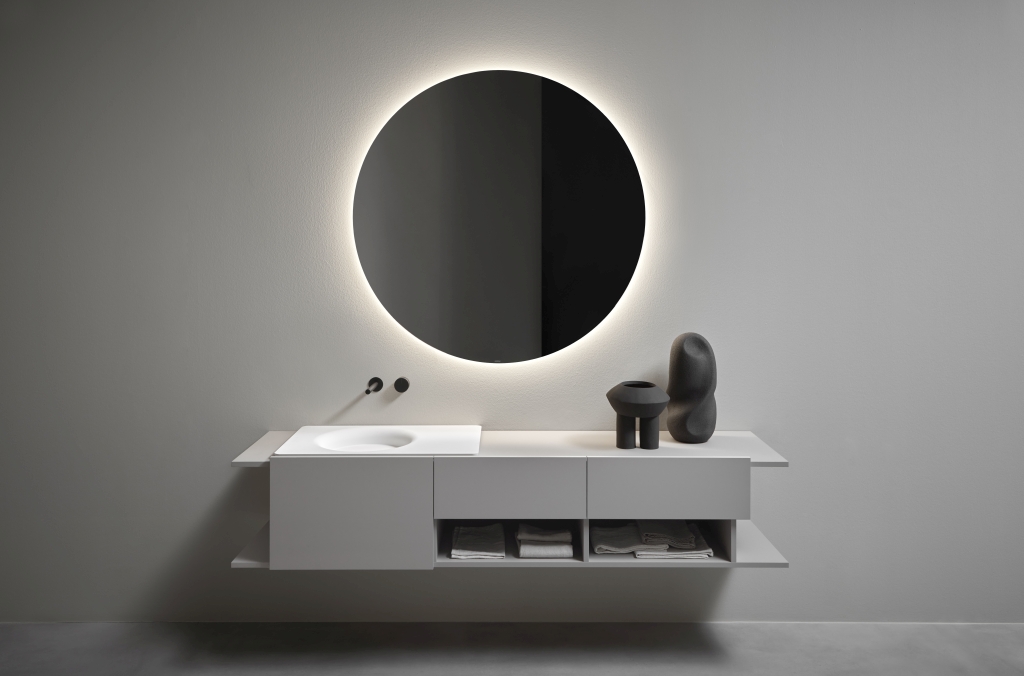 CARPET si distingue per l’essenzialità formale e per l’elevata flessibilità installativa. Il lavabo integrato è reversibile e può essere installato in posizione centrale oppure decentrata rispetto al mobile Nemesis, adattandosi alle diverse esigenze progettuali.