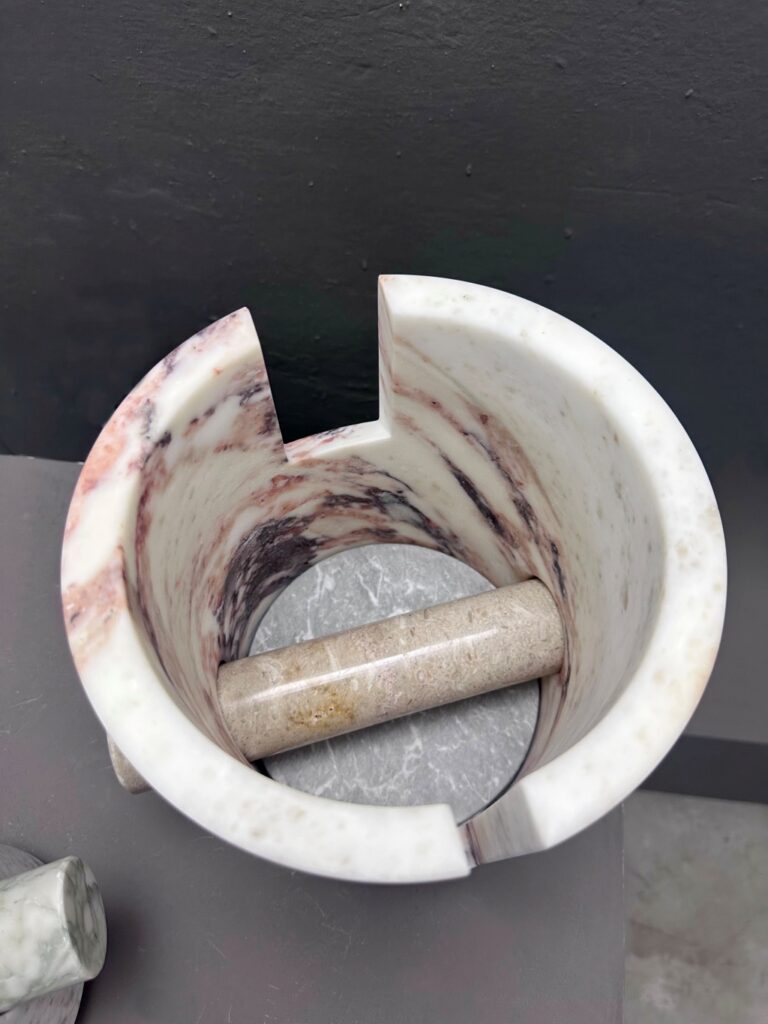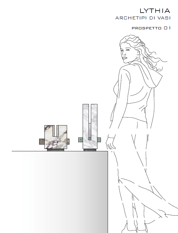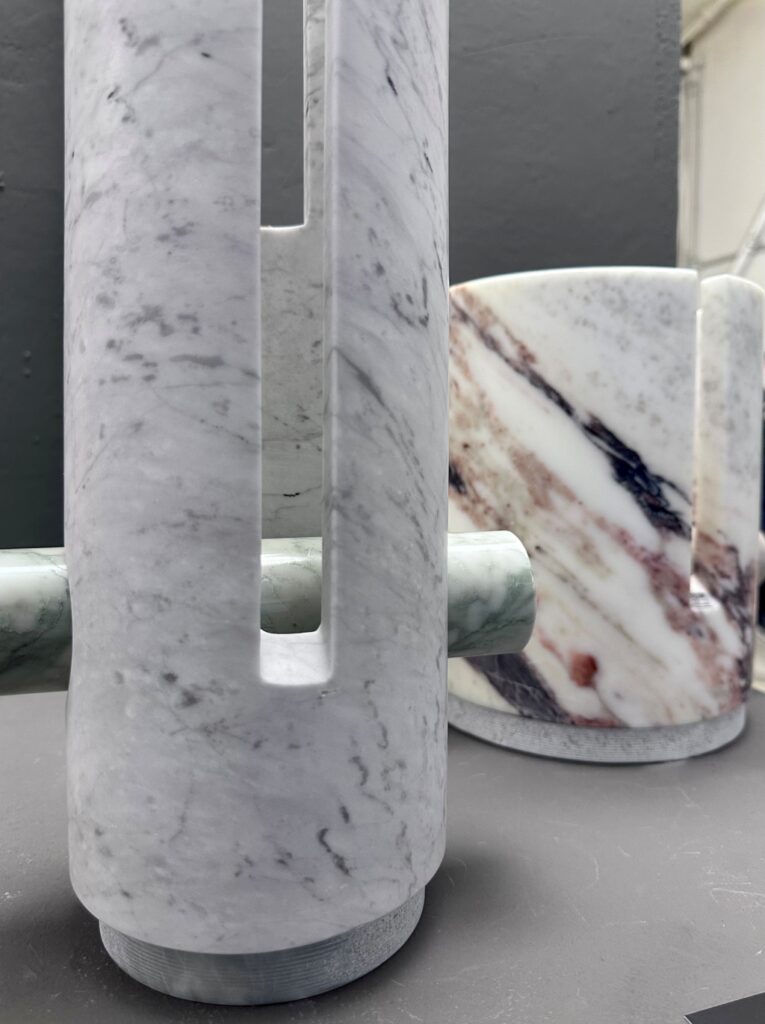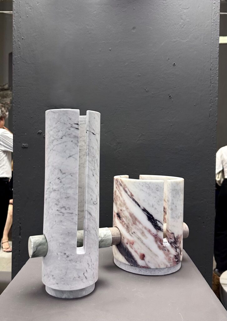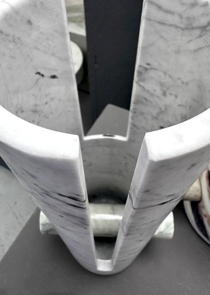 Tra le opere spicca Lythia, progetto firmato dall’architetta Valeria Eva Rossi, che torna a Carrara per restituire forma e significato alla materia della sua terra. Composta da due vasi numerati e firmati, la collezione nasce dall’incontro tra geometrie archetipiche e la memoria millenaria del marmo apuano. Le sue forme essenziali – base, corpo verticale e cilindro orizzontale – si compenetrano in un dialogo simbolico tra pieni e vuoti, maschile e femminile, stabilità e movimento. Lythia racconta il tempo della pietra e la tensione verso nuove visioni, incarnando perfettamente lo spirito della rassegna: un equilibrio tra radici e contemporaneità.